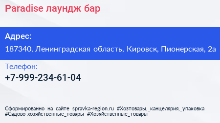 Paradise, лаундж-бар по адресу 187340, Ленинградская область, Кировск, Пионерская, 2а в дальнейшем Организация, размещена в следующих категориях: