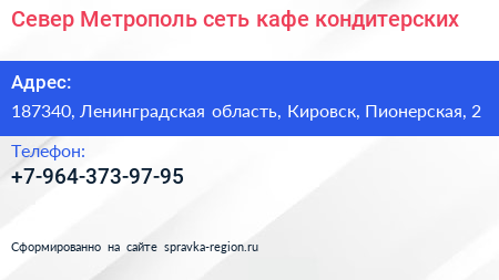 Север-Метрополь, сеть кафе-кондитерских по адресу 187340, Ленинградская область, Кировск, Пионерская, 2 в дальнейшем Организация, размещена в следующих категориях: