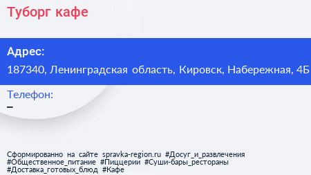 Туборг, кафе по адресу 187340, Ленинградская область, Кировск, Набережная, 4Б в дальнейшем Организация, размещена в следующих категориях: