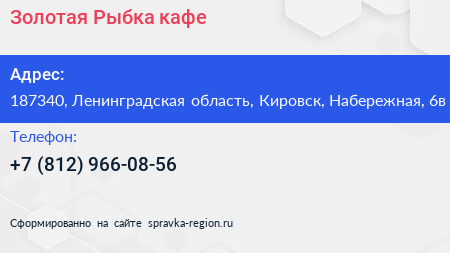Золотая Рыбка, кафе по адресу 187340, Ленинградская область, Кировск, Набережная, 6в в дальнейшем Организация, размещена в следующих категориях: