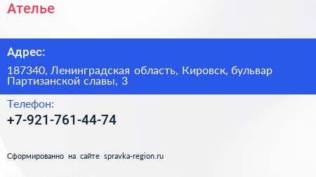 Ателье по адресу 187340, Ленинградская область, Кировск, бульвар Партизанской славы, 3 в дальнейшем Организация, размещена в следующих категориях: