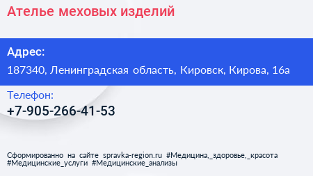 Ателье меховых изделий по адресу 187340, Ленинградская область, Кировск, Кирова, 16а в дальнейшем Организация, размещена в следующих категориях: