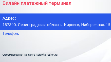 Билайн, платежный терминал по адресу 187340, Ленинградская область, Кировск, Набережная, 15 в дальнейшем Организация, размещена в следующих категориях:
