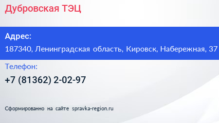 Дубровская ТЭЦ по адресу 187340, Ленинградская область, Кировск, Набережная, 37 в дальнейшем Организация, размещена в следующих категориях: