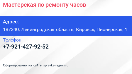 Мастерская по ремонту часов по адресу 187340, Ленинградская область, Кировск, Пионерская, 1 в дальнейшем Организация, размещена в следующих категориях: