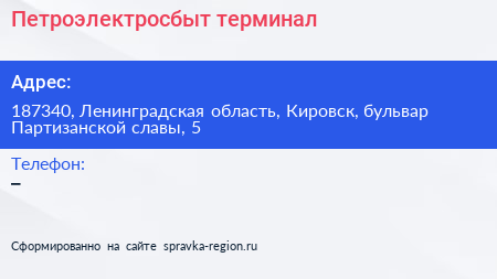 Петроэлектросбыт, терминал по адресу 187340, Ленинградская область, Кировск, бульвар Партизанской славы, 5 в дальнейшем Организация, размещена в следующих категориях: