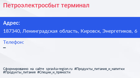 Петроэлектросбыт, терминал по адресу 187340, Ленинградская область, Кировск, Энергетиков, 6 в дальнейшем Организация, размещена в следующих категориях: