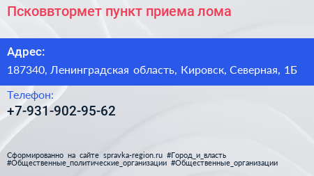 Псковвтормет, пункт приема лома по адресу 187340, Ленинградская область, Кировск, Северная, 1Б в дальнейшем Организация, размещена в следующих категориях: