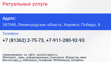 Ритуальные услуги по адресу 187340, Ленинградская область, Кировск, Победы, 8 в дальнейшем Организация, размещена в следующих категориях: