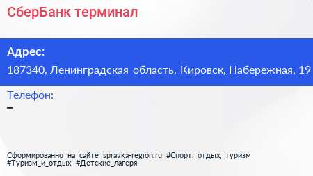 СберБанк, терминал по адресу 187340, Ленинградская область, Кировск, Набережная, 19 в дальнейшем Организация, размещена в следующих категориях: