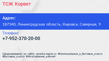 ТСЖ Корвет по адресу 187340, Ленинградская область, Кировск, Северная, 9 в дальнейшем Организация, размещена в следующих категориях: