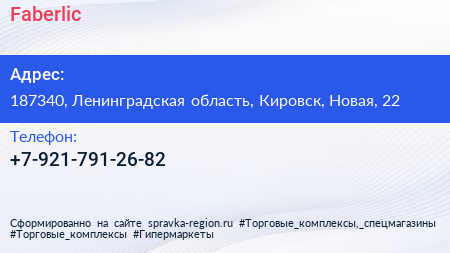 Faberlic по адресу 187340, Ленинградская область, Кировск, Новая, 22 в дальнейшем Организация, размещена в следующих категориях: