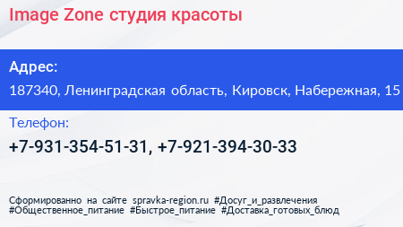 Image Zone, студия красоты по адресу 187340, Ленинградская область, Кировск, Набережная, 15 в дальнейшем Организация, размещена в следующих категориях: