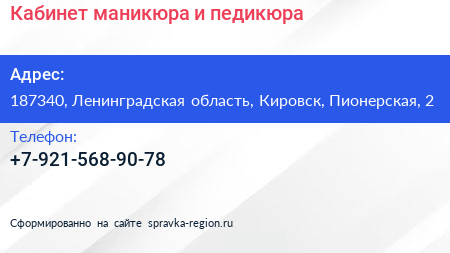 Кабинет маникюра и педикюра по адресу 187340, Ленинградская область, Кировск, Пионерская, 2 в дальнейшем Организация, размещена в следующих категориях: