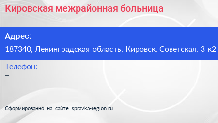 Кировская межрайонная больница по адресу 187340, Ленинградская область, Кировск, Советская, 3 к2 в дальнейшем Организация, размещена в следующих категориях: