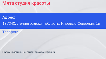 Мята, студия красоты по адресу 187340, Ленинградская область, Кировск, Северная, 1в в дальнейшем Организация, размещена в следующих категориях: