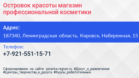 Островок красоты, магазин профессиональной косметики по адресу 187340, Ленинградская область, Кировск, Набережная, 15 в дальнейшем Организация, размещена в следующих категориях: