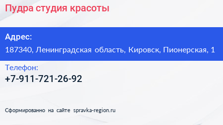 Пудра, студия красоты по адресу 187340, Ленинградская область, Кировск, Пионерская, 1 в дальнейшем Организация, размещена в следующих категориях: