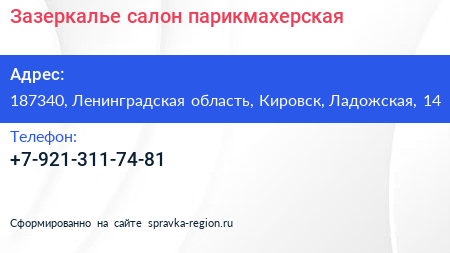 Зазеркалье, салон-парикмахерская по адресу 187340, Ленинградская область, Кировск, Ладожская, 14 в дальнейшем Организация, размещена в следующих категориях: