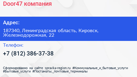 Door47, компания по адресу 187340, Ленинградская область, Кировск, Железнодорожная, 22 в дальнейшем Организация, размещена в следующих категориях: