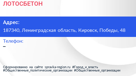 ЛОТОСБЕТОН по адресу 187340, Ленинградская область, Кировск, Победы, 48 в дальнейшем Организация, размещена в следующих категориях: