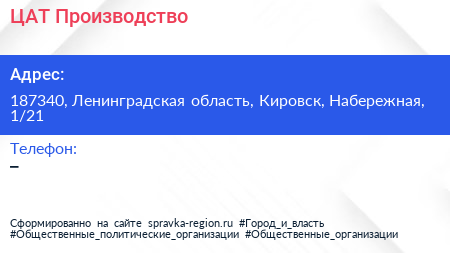 ЦАТ-Производство по адресу 187340, Ленинградская область, Кировск, Набережная, 1/21 в дальнейшем Организация, размещена в следующих категориях: