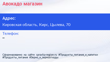 Авокадо, магазин по адресу Кировская область, Кирс, Цылева, 70 в дальнейшем Организация, размещена в следующих категориях: