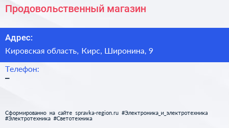 Продовольственный магазин по адресу Кировская область, Кирс, Широнина, 9 в дальнейшем Организация, размещена в следующих категориях: