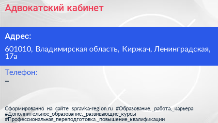 Адвокатский кабинет по адресу 601010, Владимирская область, Киржач, Ленинградская, 17а в дальнейшем Организация, размещена в следующих категориях: