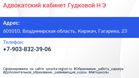 Адвокатский кабинет Гудковой Н.Э. по адресу 601010, Владимирская область, Киржач, Гагарина, 23 в дальнейшем Организация, размещена в следующих категориях:
