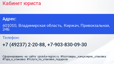 Кабинет юриста по адресу 601010, Владимирская область, Киржач, Привокзальная, 24Б в дальнейшем Организация, размещена в следующих категориях: