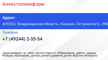 Алекстелеинформ по адресу 601012, Владимирская область, Киржач, Островского, 29Б в дальнейшем Организация, размещена в следующих категориях: