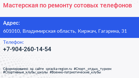 Мастерская по ремонту сотовых телефонов по адресу 601010, Владимирская область, Киржач, Гагарина, 31 в дальнейшем Организация, размещена в следующих категориях: