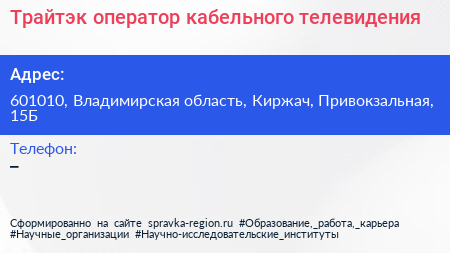 Трайтэк, оператор кабельного телевидения по адресу 601010, Владимирская область, Киржач, Привокзальная, 15Б в дальнейшем Организация, размещена в следующих категориях:
