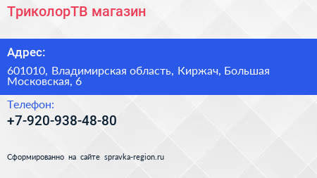 ТриколорТВ, магазин по адресу 601010, Владимирская область, Киржач, Большая Московская, 6 в дальнейшем Организация, размещена в следующих категориях: