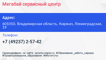 Мегабай, сервисный центр по адресу 601010, Владимирская область, Киржач, Ленинградская, 19 в дальнейшем Организация, размещена в следующих категориях: