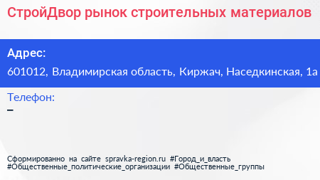 СтройДвор, рынок строительных материалов по адресу 601012, Владимирская область, Киржач, Наседкинская, 1а в дальнейшем Организация, размещена в следующих категориях:
