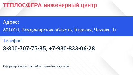 ТЕПЛОСФЕРА, инженерный центр по адресу 601010, Владимирская область, Киржач, Чехова, 1г в дальнейшем Организация, размещена в следующих категориях: