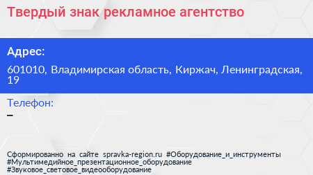Твердый знак, рекламное агентство по адресу 601010, Владимирская область, Киржач, Ленинградская, 19 в дальнейшем Организация, размещена в следующих категориях: