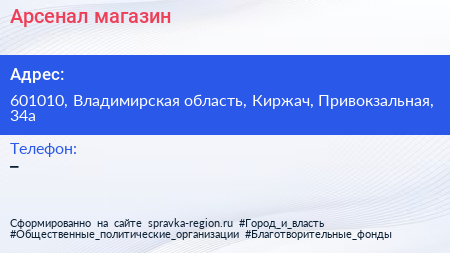 Арсенал, магазин по адресу 601010, Владимирская область, Киржач, Привокзальная, 34а в дальнейшем Организация, размещена в следующих категориях: