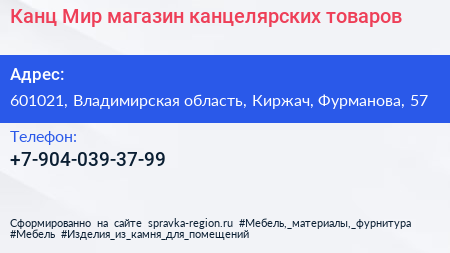 Канц Мир, магазин канцелярских товаров по адресу 601021, Владимирская область, Киржач, Фурманова, 57 в дальнейшем Организация, размещена в следующих категориях: