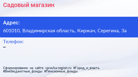 Садовый магазин по адресу 601010, Владимирская область, Киржач, Серегина, 3а в дальнейшем Организация, размещена в следующих категориях: