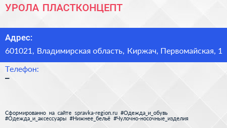 УРОЛА ПЛАСТКОНЦЕПТ по адресу 601021, Владимирская область, Киржач, Первомайская, 1 в дальнейшем Организация, размещена в следующих категориях: