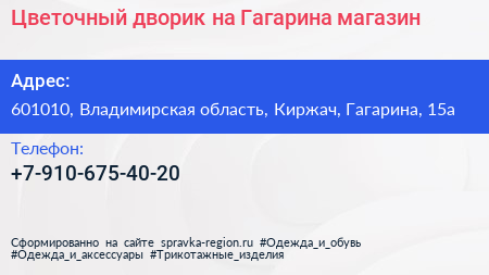Цветочный дворик на Гагарина, магазин по адресу 601010, Владимирская область, Киржач, Гагарина, 15а в дальнейшем Организация, размещена в следующих категориях: