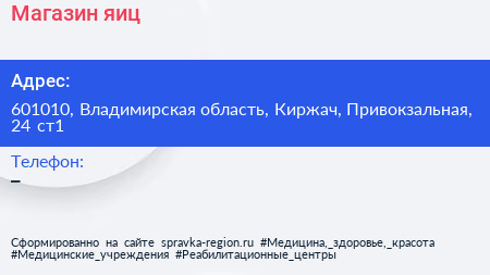 Магазин яиц по адресу 601010, Владимирская область, Киржач, Привокзальная, 24 ст1 в дальнейшем Организация, размещена в следующих категориях:
