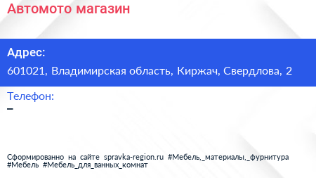 Автомото, магазин по адресу 601021, Владимирская область, Киржач, Свердлова, 2 в дальнейшем Организация, размещена в следующих категориях:
