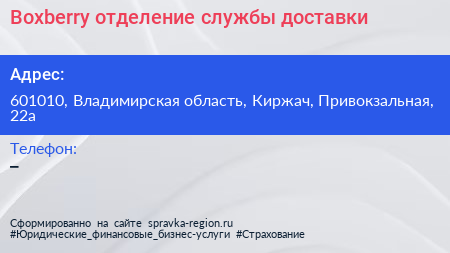 Boxberry, отделение службы доставки по адресу 601010, Владимирская область, Киржач, Привокзальная, 22а в дальнейшем Организация, размещена в следующих категориях:
