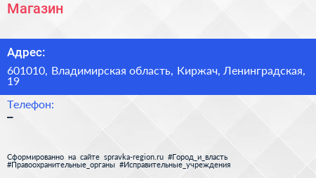 Магазин по адресу 601010, Владимирская область, Киржач, Ленинградская, 19 в дальнейшем Организация, размещена в следующих категориях: