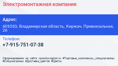 Электромонтажная компания по адресу 601010, Владимирская область, Киржач, Привокзальная, 26 в дальнейшем Организация, размещена в следующих категориях: