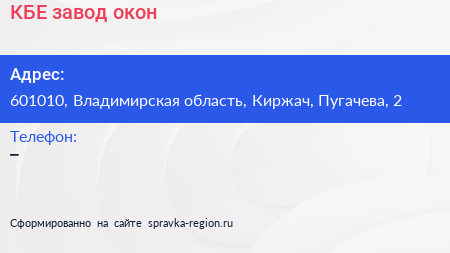 КБЕ, завод окон по адресу 601010, Владимирская область, Киржач, Пугачева, 2 в дальнейшем Организация, размещена в следующих категориях: